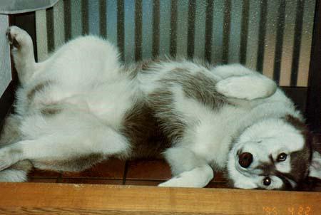 甘えんぼのチョビです お腹を出して、撫でてよぉ 誰が来ても吠えなくて、撫でてもらってました ハスキーは番犬に適さないの見本のような子です |