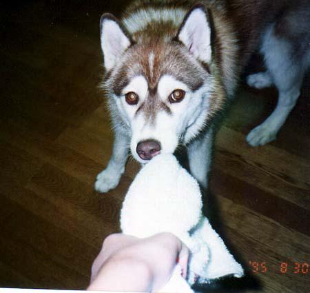 引っ張りっこ遊びも大好き 噛む力が強い子だったので結構いろんな物がボロボロ 洋服でも引っ張りっこしようとするから それはやめてくれ〜・・・でした しかし、泣く子と子犬には勝てず、結局トレーナーは全部買い換えるハメに(; ;) |