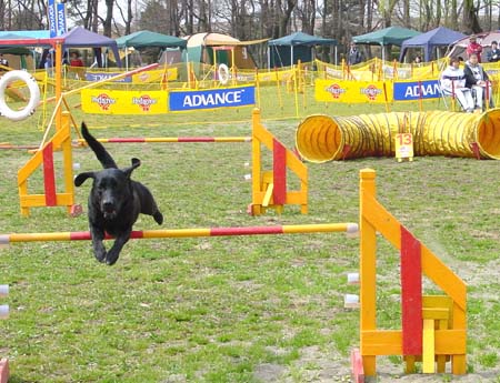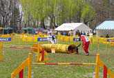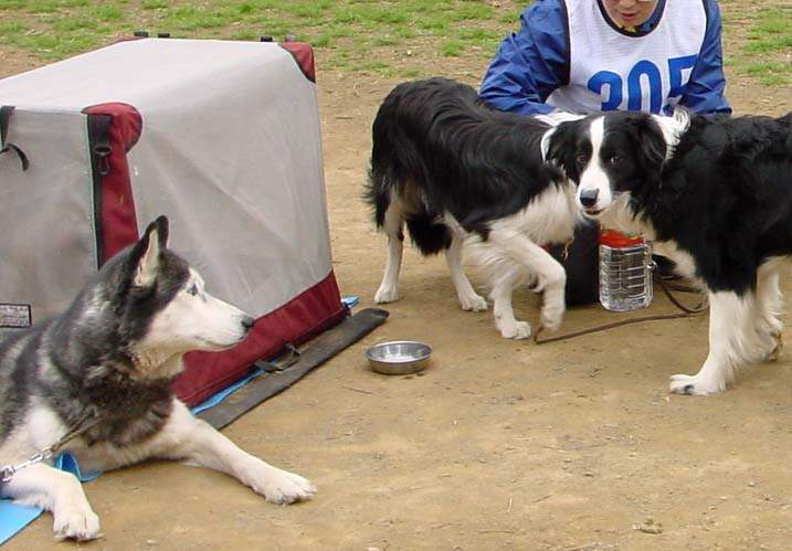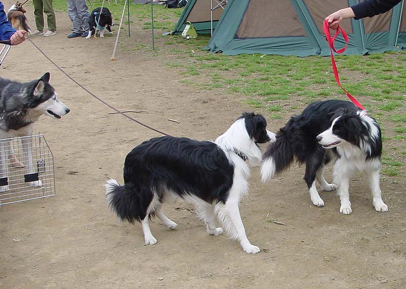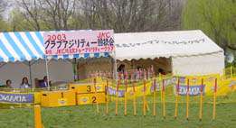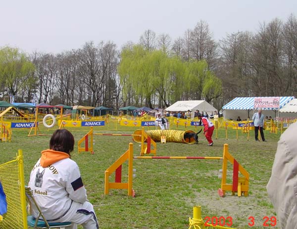 3月29日(日)は埼玉北ドゥーアジリティークラブ主催のアジリティー競技会でした。 秋ヶ瀬のアジ会場は三つ池グランドで、会場が近い時ほど良くやる遅刻! 到着した時には既にママ&ティナの出場するJP-1の検分を開始していて、 ミニ&ミディクラスは終了、ラージも奇数番号は終わっていて、偶数番号の検分が始まっていた(^_^;) ベースは駐車場から近い処に陣取っていた菅○訓練所軍団の後ろに、千葉に続いての遅刻に呆れ顔の杉○先生を尻目に、設営した。雨降りの恐れもあったが風もなく暖かいので、タープは横に置いておいてオープン・カフェ・タイプで設営完了(^O^)/ 会場を見渡せば、芽吹き始めた木々の緑が美しく、柳の柔らかそうな黄緑色の未だ小さな葉を付けた枝もゆるやかに揺れ、緑の濃くなった野芝と共に「春ですなぁ〜」と穏やかな気分にしてくれる。本部テントに掲げられた『桜色』の看板も手作りで競技会の緊張感をやわらげてくれている(^_-)☆ ただし、出陳数が多いためだろう、2リンクを交互に使いかなり狭いコース設定に成っているようだ。