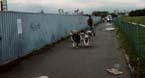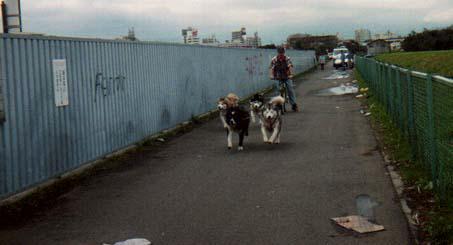 んで犬橇の練習を・・・ まず第一歩は自転車を引っ張りながら前を走る練習だよ〜 雪国なら橇で練習を始められるんだろうけどなぁ 神奈川犬橇クラブの人に教わるカイザー君 まだ1歳足らずの頃だから、意味が全然判ってないけどぉ(^_^;) |