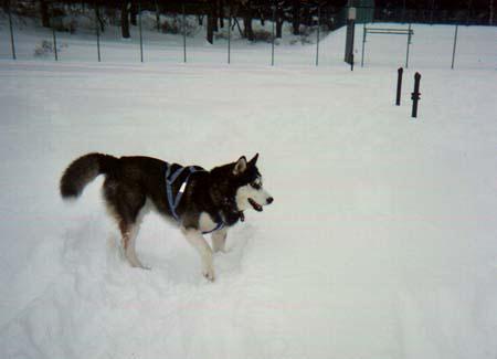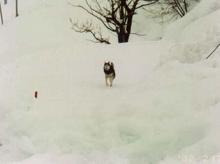 雪の中をカイザー君が走ってきます ハスキーは足の裏の毛が滑り止めの役割をします だから足の裏の毛を切ってません |